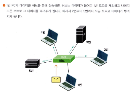 한 포트로 들어온 데이터를 나머지 모든 포트로 뿌려줌 - 랜카드가 설치된 각각의 PC들은 케이블을 타고 허브에 연결