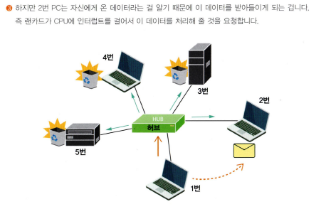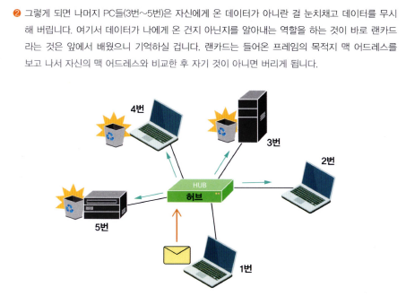 즉, 같은 허브에 붙어있는 하나의 PC가 통신을 하게 되면 다른 모든 PC는 통신을 할 수 없고,
