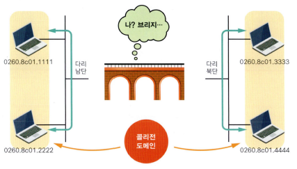 허브로 만들어진 콜리전 도메인 사이를 반으로 나누고 중간에 다리를 놓음 - 두 PC들이 다리 남단에서 통신을 하는 사이에도 다른 두 PC는 다리 북단에서 통신이 가능