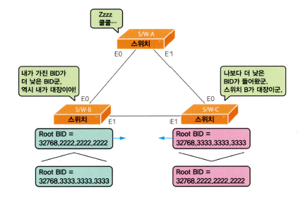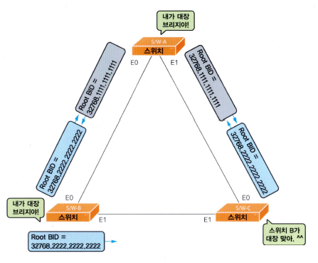 BPDU에는 자신의 BID 넣음 - 스위치는 받은 BPDU에 BID 비교하여 더 낮은 BID를 가진 스위치를 루트 브리지로 선택