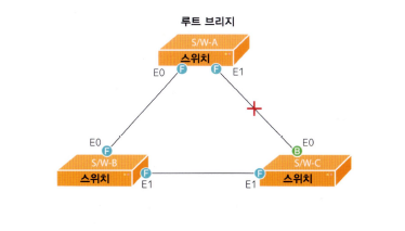 스위치 C의 E0 포트는 Blocking 상태가 됨 - 이때 스위치 C의 E1 포트는 블로킹에서 리스닝, 러닝을 거쳐 포워딩 상태로 됨