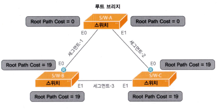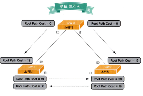 이 경우 Path Cost는 19 - 따라서 스위치 B는 E0 포트, 스위치 C는 E0 포트가 루트 포트로 선정